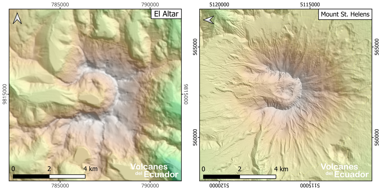 Figura 3. Mapas topográficos de los volcanes El Altar (Ecuador) y Mount St. Helens (EE.UU.). Fuente de datos topográficos para el Mount St. Helens: USGS. Notar que el mapa del Mount St. Helens está rotado 90° para empatar la dirección del deslizamiento con la del Altar.