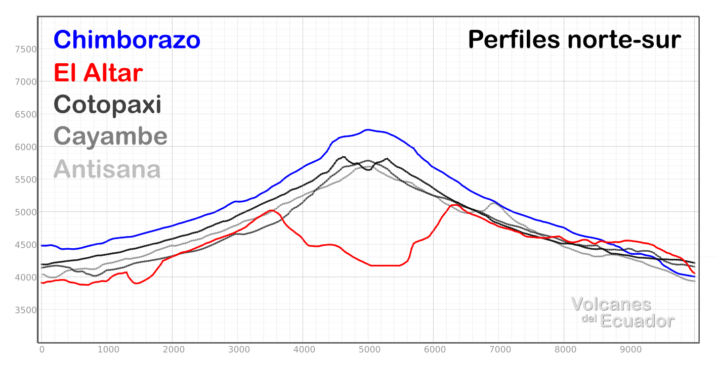 Al analizar perfiles topográficos y compararlos con los volcanes más altos del Ecuador se observa que los flancos del Altar no superan en altitud al Chimborazo ni al Cotopaxi (Fig. 2). Más bien, sus dimensiones son comparables a las del Cayambe y el Antisana. Como se mencionó, la erosión glaciar pudo haber reducido la altura de los flancos del volcán; aun así, esta comparación permite proponer una altura mínima para el Altar entre 5 693 m (altitud del Antisana según el Instituto Geográfico Militar) y 5 790 m (altitud del Cayambe según la misma fuente).